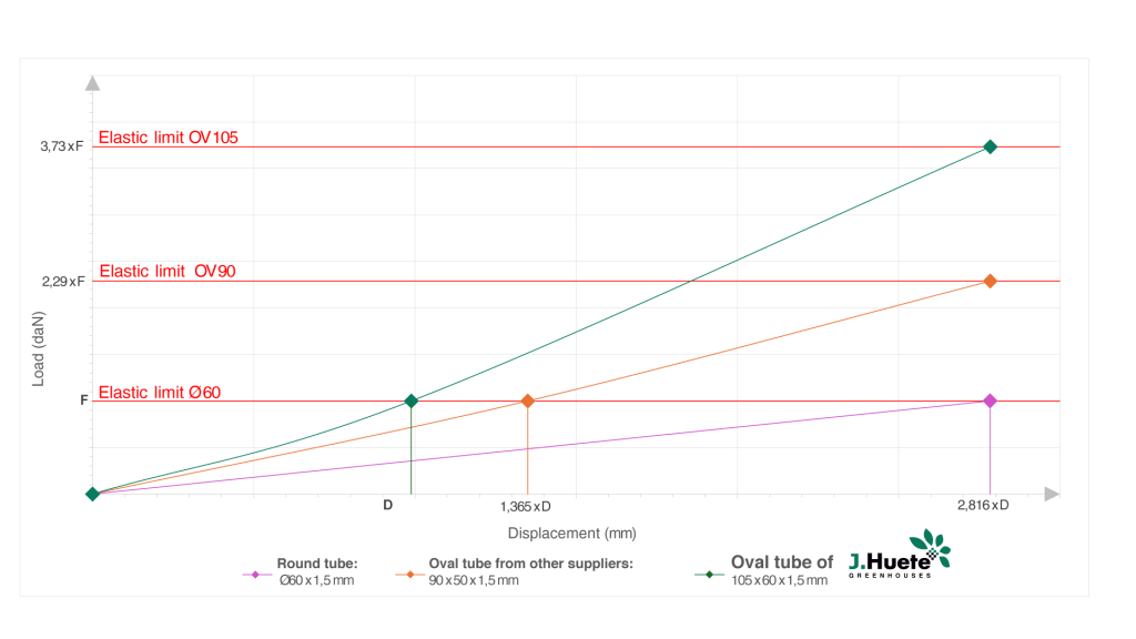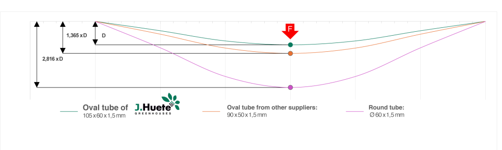 Under the same load, the J. Huete Greenhouses oval tube has a deflection 2.816 times lower than that of the round tube, and 1.365 times lower than that of the oval tube of other brands.